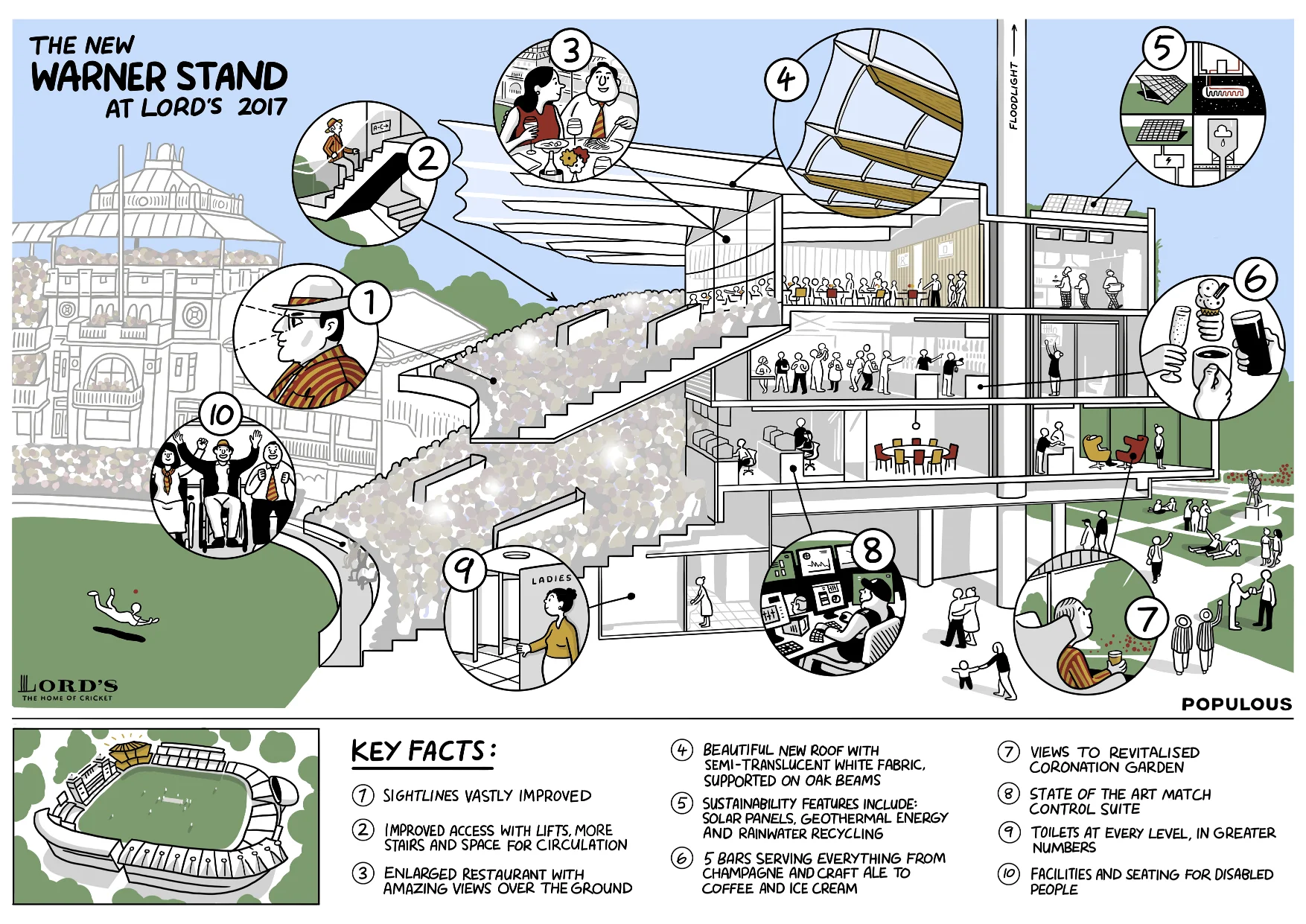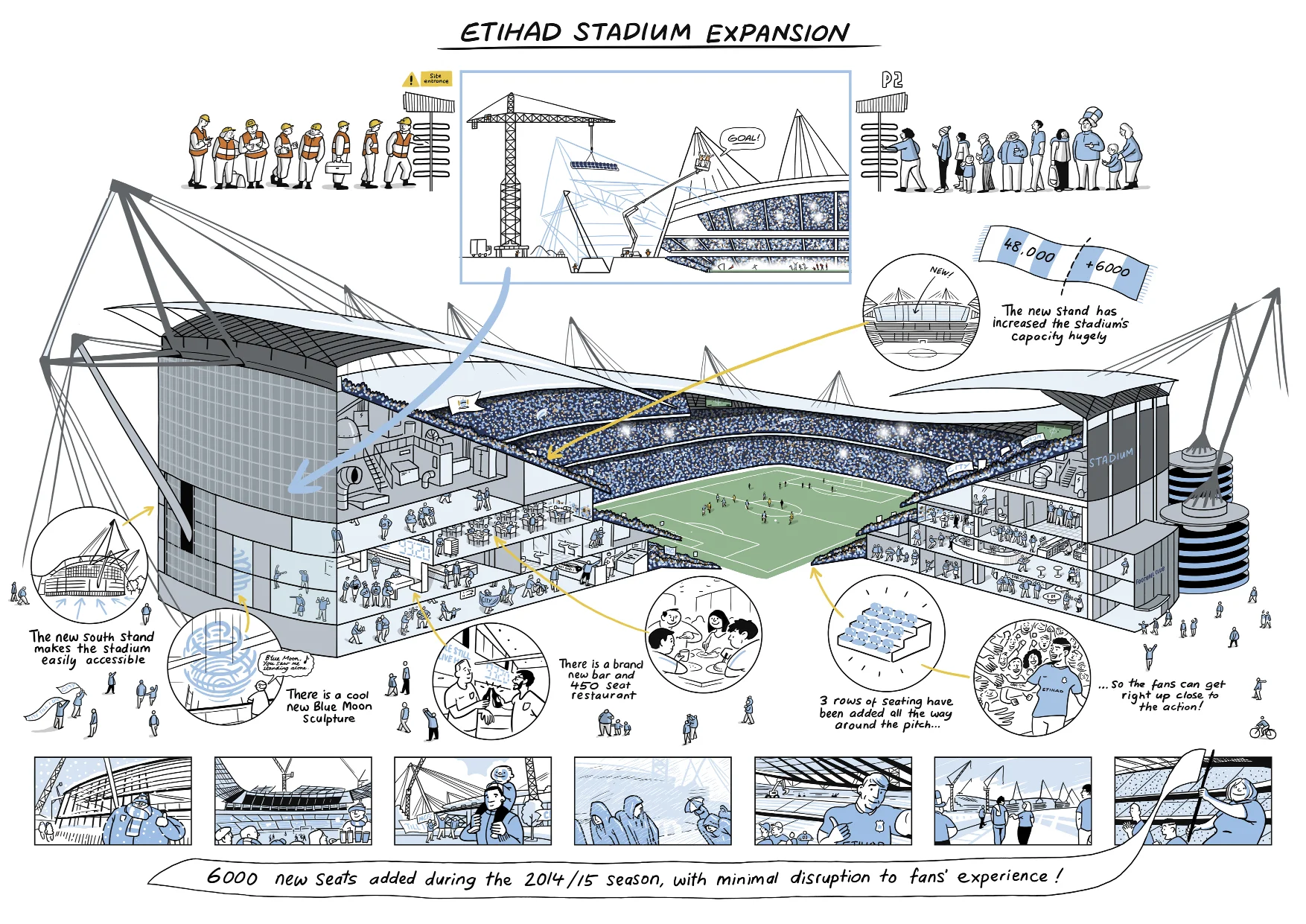 Architects can be a tad stuffy, but the architects at Populous are different. They design buildings for a unique audience – sports fans. Most of the architects are sports fans themselves, so they know how important it is to get the fans on board when they’re designing a team’s new home stadium. We wanted to create a fun way of updating them on new project developments and came up with the idea of using illustrated cross sections like the ones you’d see in kids’ books to bring the buildings to life. I worked with an illustrator at Scriberia to create these detailed images, which have been used in magazines, match day programmes, club museums and on websites.
